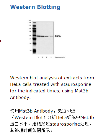 Mst3b Antibody detects endogenous levels of total Mst3b. The antibody does not cross-react with Mst3, Mst1, Mst2 or Mst4.