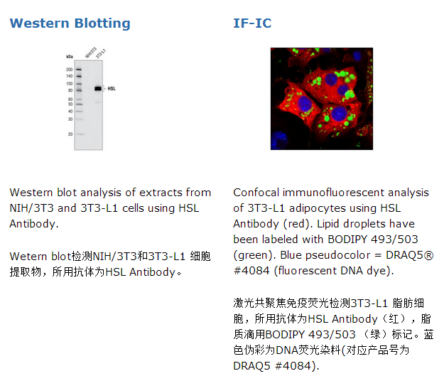 Polyclonal antibodies are produced by immunizing animals with a synthetic peptide corresponding to the sequence of human HSL. Antibodies are purified by peptide affinity chromatography.