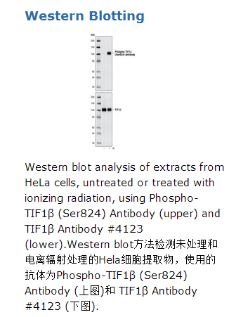 Phospho-TIF1β (Ser824) Antibody能够检测内源性丝氨酸(824位)磷酸化的TIF1β 蛋白。该多克隆抗体是由合成的人源的针对TIF1β蛋白丝氨酸(824位)的磷酸化肽段免疫动物,采用多肽亲和层析技术纯化生产的。TIF1β是转录中间因子TIF1家族的一员,属于在发育和分化中起着关键作用的转录调节子。该家族成员的主要特征在于两个保守的基序一个氨基末端的RING-B盒卷曲螺旋基序和一个羧基末端的PHD手指和溴区单元(1,2)。TIF1β是含有锌指蛋白的KRAB(Kruppel 相关盒)结构域的辅助抑制物。含有锌指基序的KRAB结构域是转录因子的一大组,为脊椎动物所特有,其表达模式在不同物种间不同,被认为能够调节控制形态的基因转录程序(3,4)。TIF1β已经被证实为早期胚胎发育和精子发生所必需(6,5)。其功能是激活或抑制转录以响应环境或发育信号,主要通过染色质重构和组蛋白修饰。TIF1β的招募以及和异染色质蛋白(HP1)的联合是转录抑制必不可少的,而且为F9胚胎肿瘤细胞的分化所必需(6,7)。TIF1β也在DNA损伤反应中起作用。TIF1β的第842位丝氨酸发生ATM依赖方式的磷酸化应答基因毒性应激且为染色体松弛所必需,转而为DNA损伤反应所必需(8)。