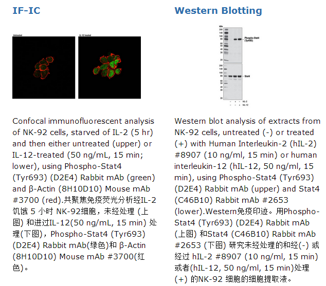 Phospho-Stat4 (Tyr693) (D2E4) Rabbit mAb 兔单抗只能检测内源的在tyr693位点磷酸的Stat4蛋白。此单克隆抗体是通过合成人源对应的Stat4 Tyr693位点周围的多肽段来免疫动物而获得。Jak-Stat信号通路被很多的细胞因子,生长因子和激素所利用(1)。受体诱导的 Jak家族蛋白的酪氨酸磷酸化引起Stat蛋白的磷酸化导致他们入核,与DNA原件结合并活化转录。Stats所调控反应显著的专一性和范围一部分受控于组织特异性表达不同的细胞因子受体,Jaks 和 Stats同时也与不同的Stat成员偶联到不同的受体上的组合有关(2)。Stat4主要是在脾、胸腺和睾丸组织中表达,并且作为IL-12的调节蛋白而得到研究(3-8)。Stat4的激活与Tyr693位点的磷酸化有关(9)。Stat4在NK细胞中而不是在T细胞中响应IL-2而激活(10)。