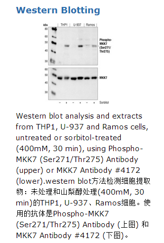 Phospho-MKK7 (Ser171/Thr275) Antibody兔多抗能检测内源性Ser271位点和Thr275位点磷酸化的MKK7蛋白水平。该抗体不能与磷酸化的SEK1/MKK4、其他磷酸化的MAPKK发生交叉反应。该多克隆抗体能够采用合成的与人源MKK7蛋白Ser271/Thr275位点周围残基相一致的磷酸化肽段免疫动物而获得。MKK7是一种MAPKK,它是JNK/SAPK通路的特异性活化因子(1,2)。MKK7能被TNFα以及其他环境压力显著激活,然而能激活 p38、JNK/SAPK通路的SEK1/MKK4却不能被TNFα所激活(2)。对MAPKK家族成员活化环的序列比对表明,MKK7蛋白的Ser271和Thr275位点是潜在的磷酸化位点,这两个位点对激酶的活性十分重要。