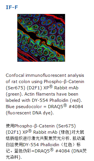 磷酸化-β-Catenin (Ser675) (D2F1) XP®的兔单抗仅识别Ser675磷酸化的内源性β-Catenin蛋白.此单克隆抗体是通过一种合成的磷酸化肽段去免疫动物产生。这种合成的肽段与人β-catenin邻近Ser675的氨基酸残基序列一致.β-catenin是Wnt信号通路下游的重要效应分子(1)。在脊椎动物体内它涉及到两个重要的生物过程:早期胚胎发育(2)和肿瘤发生(3)。CK1可以磷酸化β-catenin 45位丝氨酸。该磷酸化将导致β-catenin能够随后被GSK-3磷酸化(4-6)。GSK-3β通过磷酸化β-catenin Ser33, Ser37, 和 Thr41,并促使其进一步被降解(7)。这些位点发生突变会提高β-catenin蛋白稳定性,并且已在多种癌细胞株中发现这些突变(8)。PKA磷酸化β-Catenin的675位丝氨酸,此位点的磷酸化诱导β-catenin在核内的累积,增加它的转录活性(9,10) .