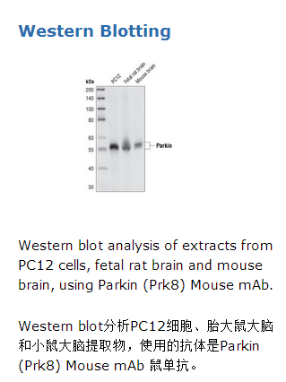 Parkin (Prk8) Mouse mAb detects endogenous levels of total parkin protein.