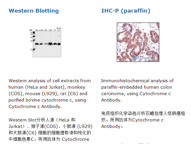 Cytochrome c Antibody detects endogenous levels of cytochrome c protein.
