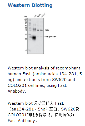 FasL Antibody detects endogenous levels of total FasL protein. The antibody is expected to react with both membrane bound and soluble forms of FasL. No cross reactivity was detected with other family members.