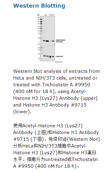 Acetyl-Histone H3 (Lys27) Antibody detects endogenous levels of histone H3 when acetylated on Lys27. This antibody shows weak cross-reactivity with histone H3 acetylated on Lys9. This antibody does not cross-react with Histone H3 acetylated on lysines 14, 18 and 56.