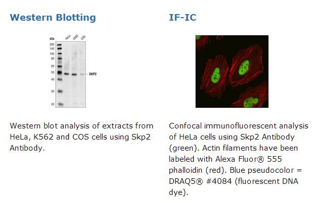该抗体是通过合成与人Skp2蛋白氨基末端邻近的氨基酸残基序列一致的肽段,免疫动物获得,抗体经Protein A和肽亲和层析纯化。 Western blot analysis of extracts from HeLa, K562 and COS cells using Skp2 Antibody. 利用Skp2抗体对HeLa,K562和COS等细胞提取物中该蛋白进行Western blot分析的结果。 Confocal immunofluorescent analysis of HeLa cells using Skp2 Antibody (green). Actin filaments have been labeled with Alexa Fluor® 555 phalloidin (red). Blue pseudocolor = DRAQ5® #4084 (fluorescent DNA dye). 使用Skp2抗体在HeLa细胞中检测该蛋白的共聚焦免疫荧光分析结果(绿色),微丝经Alexa Fluor®555 phalloidin(红色)标记,蓝色假染色为 DRAQ5®#4084(DNA荧光染料)。