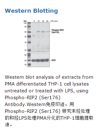 Phospho-RIP2 (Ser176) Antibody只能检测内源的在Ser176位点磷酸化的RIP2蛋白。背景中有一条未知来源并且分子量稍高的条带。此多克隆抗体是通过合成人源对应的RIP2 Ser176位点周围的肽段来免疫动物而获得。抗体是通过protein A和多肽亲和层析纯化。受体相互作用蛋白2 (RIP2)是一个丝氨酸/苏氨酸激酶,具有C-末端的级联反应激活区和招募区(CARD)。连接RIP2 与肿瘤坏死因子受体(TNFR)引起了NF-kB信号的激活并诱导了凋亡(1-3)。将巨噬细胞暴露到细菌细胞壁成分如LPS中能够诱导 RIP2的表达。RIP2缺失的小鼠模型表明此激酶在天然免疫和获得性免疫中整合并传导的信号(4,5)。Serine 176位点是调控自磷酸化的位点,它能用来监控 RIP2的活性状态(6)。