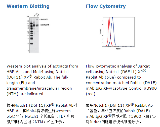 Notch1 (D6F11) XP® Rabbit可以识别内源的总notch1蛋白。它能够识别Notch1的全长蛋白(~300 kDa)和跨膜/细胞内结构NTM(~120 kDa)。合成与人源notch蛋白的Gln2497氨基酸残基序列一致的肽段,免疫动物获得单克隆抗体。Notch1是一个在细胞发育和命运决定过程中发挥功能的跨膜蛋白(1)。在notch1成熟过程中,notch1分子细胞外结构域会被一个成对碱性氨基酸蛋白酶样的转化酶剪切(2)。在与配体如Delta1结合或是细胞外钙离子耗竭后,notch1的羧基端被释放并随后在Gly1743 和 Val1744之间被切开(3,4)。结果导致细胞内处于活化状态的notch1片段转运至细胞核内并转录激活。