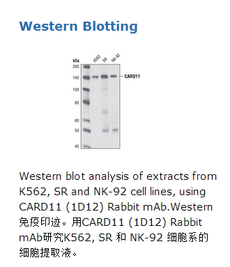 CARD11 (1D12) Rabbit mAb detects endogenous levels of total CARD11 protein.