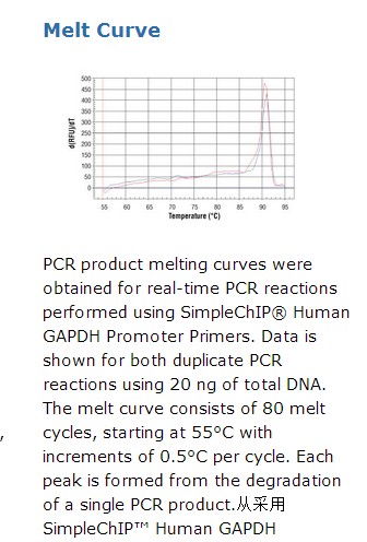 SimpleChIP® Human GAPDH Promoter Primers contain a mix of forward and reverse PCR primers that are specific to a region of the human glyceraldehyde-3-phosphate dehydrogenase (GAPDH) promoter. These primers can be used to amplify DNA that has been isolated using chromatin immunoprecipitation (ChIP). Primers have been optimized for use in SYBR® Green quantitative real-time PCR and have been tested in conjunction with SimpleChIP® Enzymatic Chromatin IP Kits #9002 and #9003 and ChIP-validated antibodies from Cell Signaling Technology®. The GAPDH gene is actively transcribed in all cell types and its promoter is highly enriched for histone modifications associated with active transcription, such as histone H3 Lys4 tri-methylation and general histone acetylation. This gene promoter shows very low levels of histone modifications associated with heterochromatin, such as histone H3 Lys9 or Lys27 tri-methylation.