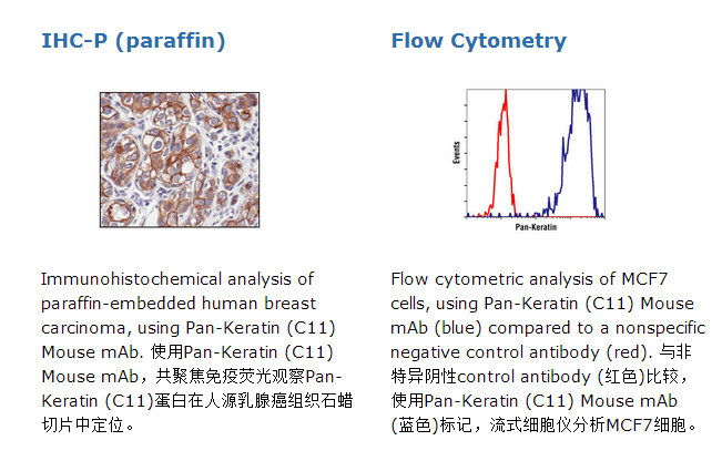 Pan-Keratin (C11) Mouse mAb detects endogenous levels of total keratin 4, 5, 6, 8, 10, 13 and 18. The antibody does not cross-react with other keratins.