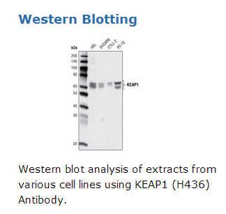 KEAP1 (H436)抗体识别内源性的KEAP1总蛋白水。 Western blot analysis of extracts from various cell lines using KEAP1 (H436) Antibody. 使用KEAP1(H436)抗体对不同细胞裂解物进行免疫印迹分析的结果。
