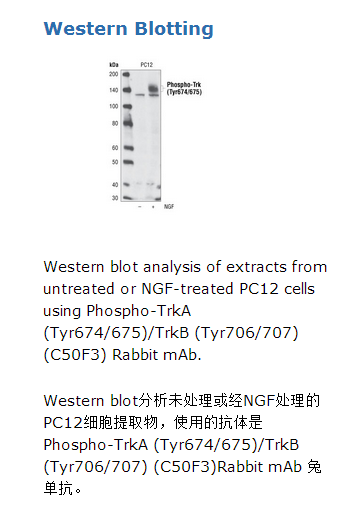 Phospho-TrkA (Tyr674/675)/TrkB (Tyr706/707) (C50F3) Rabbit mAb detects endogenous levels of TrkA and TrkB only when phosphorylated at Tyr674/675 of TrkA and Tyr706/707 of TrkB. The antibody may cross-react with a protein of ~150 kDa phosphorylated at an unknown tyrosine residue.