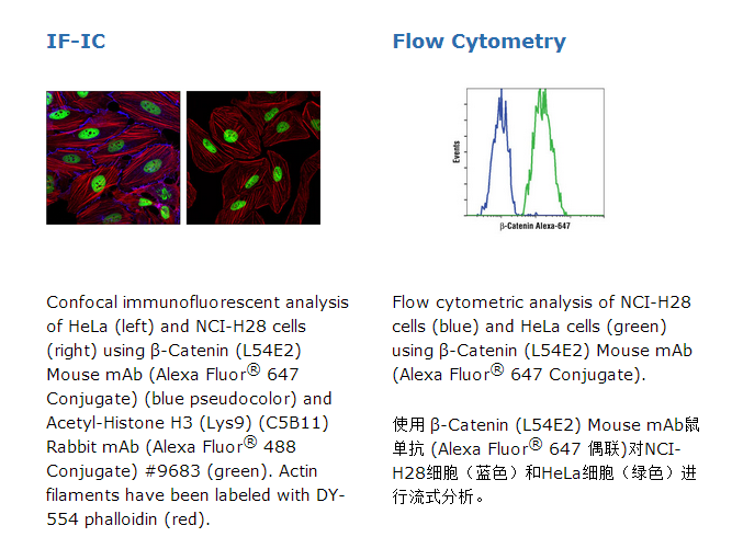 β-Catenin (L54E2) Mouse mAb (Alexa Fluor®647 Conjugate) detects endogenous levels of total β-catenin protein.