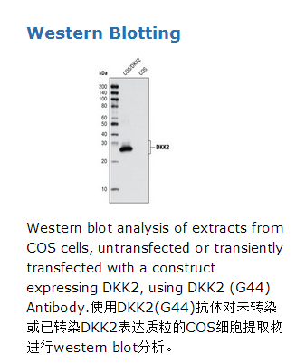 DKK2 (G44) Antibody detects transfected levels of human DKK2 protein. This antibody does not cross-react with DKK1.