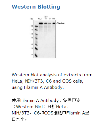 Filamin A Antibody检测内源性Filamin A总蛋白。该抗体可能与filamin B和C发生交叉反应。通过人工合成人源filamin A蛋白相应的多肽片段去免疫动物从而制备出多克隆抗体。通过蛋白A和多肽亲和层析纯化抗体。Filamins蛋白是二聚化actin结合蛋白的家族,其功能是作为细胞粘附位点的结构性组件。对于亚细胞内信号分子的靶点它们也作为一个支架(1)。actin结合域(alpha-actinin domain)是定位在特有的氨基末端,接着是多达24串联的大约96残基重复序列,而二聚体化结构域是位于该蛋白羧基末端。除actin filaments之外,filamins与其它结构上分子和信号分子例如beta-integrins、Rho/Rac/Cdc42、PKC和insulin receptor有关联,但主要通过部分羧基末端区域(1-3)。高丰度的Filamin A蛋白和低丰度的filamin B蛋白是广泛表达的亚型,而filamin C 蛋白是在肌肉中主要表达(1)。filamin A蛋白的Serine 2152位点通过PAK1激酶磷酸化,而这个磷酸化对于PAK1介导的actin细胞骨架重组是需要的(4)。