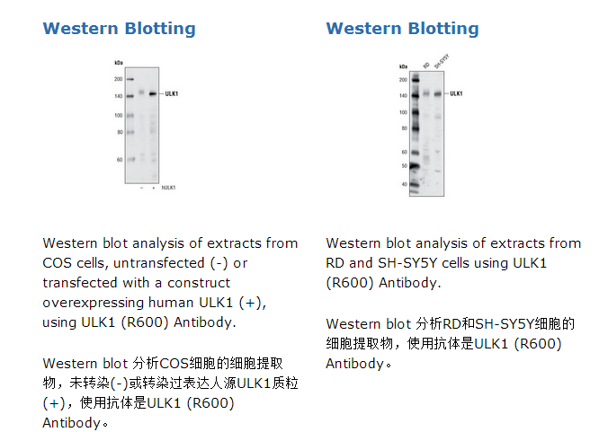 Polyclonal antibodies are produced by immunizing animals with a synthetic peptide corresponding to residues surrounding Arg600 of human ULK1. Antibodies were purified by protein A and peptide affinity chromatography.