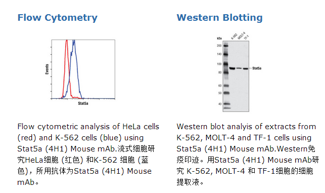 Stat5a (4H1) Mouse mAb 能够检测内源Stat5a蛋白总体水平。单克隆抗体是通过合成人源对应的Stat5a 2-104位点周围的融合肽段来免疫动物而获得。Stat5的激活是通过一系列的配体的结合而完成,包括 IL-2, GM-CSF,生长激素和泌乳刺激素。磷酸化Tyr694位点对 Stat5的活性是必须的(1,2)。此位点的磷酸化是在红细胞生成素的作用下由Src介导而完成(3)。 Stat5在某些白血病类型的细胞中有组成性的活性(4)。用IL-3处理的内皮细胞中有磷酸化的Stat5,这就表明它参与了血管再生和细胞的运动(5)。在不同细胞类型中 Stat5a 和 Stat5b 是被独立调控和激活的。例如,干扰素处理后在U-937细胞中Stat5a的活性较强但在HeLa细胞中Stat5b的活性较强(6)。
