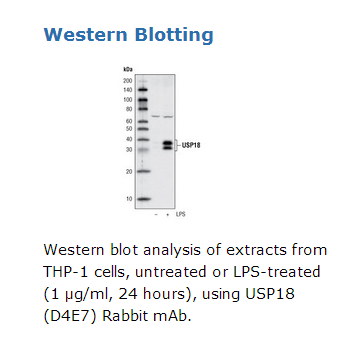 USP18 (D4E7)兔单抗是通过合成与人USP18蛋白Pro45邻近氨基酸残基序列一致的肽段,免疫动物获得。 Western blot analysis of extracts from THP-1 cells, untreated or LPS-treated (1 µg/ml, 24 hours), using USP18 (D4E7) Rabbit mAb. 使用USP18 (D4E7)兔单抗对未经或经LPS处理(1 µg/ml,24小时)的THP-1细胞的裂解物进行免疫印迹分析的结果。