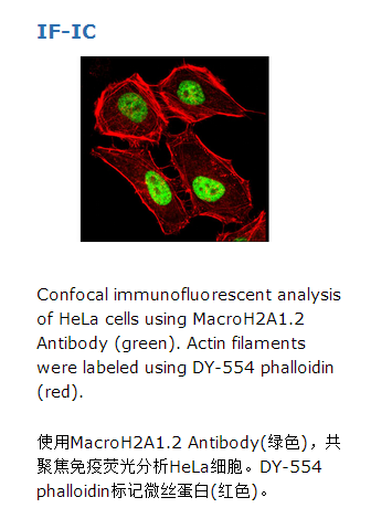 Polyclonal antibodies are produced by immunizing animals with a synthetic peptide corresponding to the human MacroH2A1.2 protein (MacroH2A1, isoform 2). Antibodies are purified by protein A and peptide affinity chromatography.