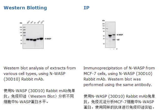 N-WASP (30D10) Rabbit mAb兔单抗检测内源性N-WASP总蛋白。该抗体不能与造血细胞的蛋白WASP发生交叉反应。通过人工合成人源N-WASP蛋白相应的多肽片段去免疫动物从而制备出单克隆抗体。Wiskott-Aldrich syndrome proteins (WASPs)在活化的Rho家族GTPases反应下通过激活Arp2/3肌动蛋白成核复合物从而介导肌动蛋白的动力。在哺乳动物中,五个WASP家族成员已经被描述。造血细胞中的WASP和广泛表达的N-WASP蛋白在未刺激的细胞中被自抑制。在刺激情况下它们通过cdc42激酶被激活,这与磷酯酰二磷酸肌醇一起解除了自抑制。三个WAVE(Wasf, SCAR)家族蛋白在与WASP and N-WASP序列上有类似性,但是缺乏WASP/N-WASP蛋白的自抑制区域以及直接被Rac激酶激活(1)。WASP和WAVE蛋白的功能显得至关重要,因为在小鼠中N-WASP或Scar-2基因敲除导致心脏和神经元的损失和胚胎的致敏性(2,3)。WASP的缺少导致免疫系统的缺损和减少免疫细胞(4)。WAVE-2 (WASF2)是广泛的分布,而WAVE-1和WAVE-3是在大脑中高表达(5)。WAVE-3蛋白可能作为一个成神经细胞瘤的肿瘤抑制因子,该病是一种交感神经系统的儿童疾病(6)。WAVE-3蛋白的增加性表达在乳腺癌中被发现,并且在乳腺癌细胞中的研究指出WAVE-3蛋白通过p38 mitogen-activated protein kinase (MAPK)通路去调节乳腺癌的进程、入侵和代谢(7,8)。