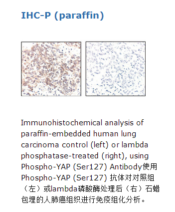 Phospho-YAP (Ser127) Antibody detects endogenous levels of YAP only when phosphorylated at serine 127.