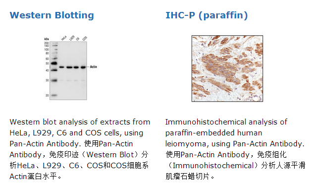 Pan-Actin抗体识别内源性的actin(所有亚型)总蛋白。该抗体也能识别glutamate 107位点剪切的30 kDa大小的actin片段。通过人工合成与人源beta-actin蛋白Asp244邻近氨基酸残基序列一致的肽段,免疫动物从而制备多克隆抗体。通过蛋白A和多肽亲和层析纯化抗体。Actin是一个广泛存在的真核细胞蛋白质,其实细胞骨架的重要组成成分。在哺乳类动物中至少有六种亚型。非肌肉组织β-和γ-actin也称作细胞质肌蛋白,它们在非肌肉组织中主要表达,目的是控制细胞结构和运动(1)。α-cardiac和α-skeletal 肌蛋白分别在心脏横纹肌和骨骼肌表达;两个平滑肌肌蛋白(α-和γ-actin)各自主要地发现在血管平滑肌和肠道平滑肌。这些肌蛋白亚型调节肌肉细胞的收缩潜能(1)。Actin主要存在作为一个纤维聚合物F-actin。在一些进程例如细胞分裂、内吞作用或应激中回应细胞骨架重组信号,cofilin促进分裂和F-actin的解聚,从而导致在单体球状形式G-actin的增加(2)。Arp2/3复合物使F-actin片段稳定,并且促进新的肌蛋白微丝形成(2)。有研究报道actin是在主要乳腺肿瘤中高度磷酸化(3)。在凋亡条件下肌蛋白的分裂已经在体外、心肌和骨骼肌中观察(4-6)。通过caspase-3剪切的Actin可能加速泛素/蛋白酶体依赖的肌肉蛋白水解(6)。