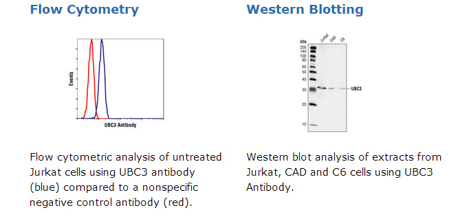 UBC3多克隆抗体通过合成对应于人UBC3蛋白序列的肽段免疫动物获得,抗体经Protein A和肽亲和层析纯化。 Western blot analysis of extracts from Jurkat, CAD and C6 cells using UBC3 Antibody. 使用UBC3抗体对Jurkat、CAD和C6细胞裂解物进行免疫印迹分析的结果。 Flow cytometric analysis of untreated Jurkat cells using UBC3 antibody (blue) compared to a nonspecific negative control antibody (red). 使用UBC3抗体对未经处理的Jurkat细胞进行流式细胞仪分析的结果(蓝色),非特异性抗体(红色)作为阴性对照。