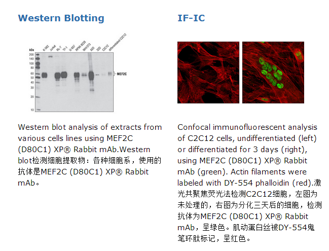 MEF2C (D80C1) XP® Rabbit mAb兔单抗能检测内源性总MEF2C蛋白水平。该单克隆抗体是通过用与人源MEF2C蛋白蛋氨酸(182位点)周围区域残基相一致的合成肽段免疫动物后获得的。MEF2C是转录因子MEF2(肌细胞增强子) 家族的成员,在哺乳动物体内,四个MEF2 C相关基因(MEF2A, MEF2B, MEF2C和 MEF2D)编码的蛋白在它们的DNA结合结构域有显著地氨基酸序列相似性,而其他部分的蛋白相似性较低(1)。起初人们认为MEF2家族成员是肌肉特异性DNA结合蛋白,它能识别许多肌肉特异性基因启动子内的MEF2结构(2,3)。最近,有一些研究小组报道了MEF2的结合活性和许多细胞中都表达MEF2,这些细胞中的MEF2蛋白在生长因子和应激诱导的早期基因应答反应过程中起了重要作用(4-6)。