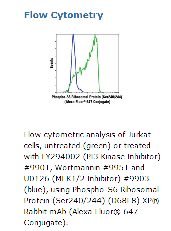 Phospho-S6 Ribosomal Protein (Ser240/244) (D68F8) XP® Rabbit mAb (Alexa Fluor® 647 Conjugate) detects endogenous levels of S6 Ribosomal Protein only when phosphorylated at Ser240/244.