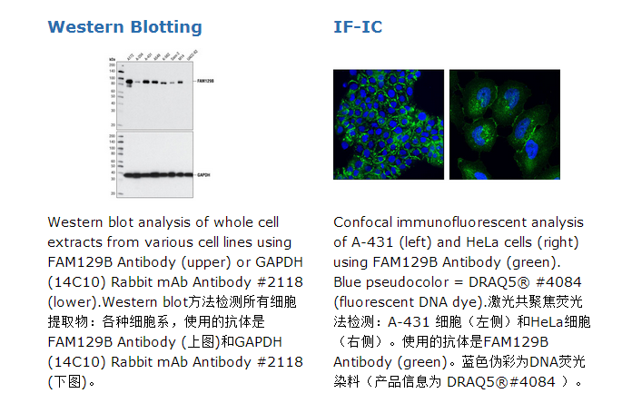 FAM129B Antibody兔多抗能识别内源性总FAM129B蛋白。该多克隆抗体通过使用与人源Fam129B蛋白谷氨酸(705位点)附近残基相一致的合成肽段免疫动物而获得。该抗体经蛋白A和肽亲和层析纯化。FAM129B/Niban-like protein 1(序列相似度 129的家族成员B)属于无显著特征的Niban蛋白家族,包括FAM129A/Niban、FAM129C/Niban-like protein 2。FAM129A/Niban蛋白参与ER应激反应,并且在甲状腺癌中蛋白水平被上调(1,2)。FAM129C/Niban-like protein 2在B细胞中优先表达,是五个生物标记物其中的一个,在大肠癌病人的全血中该蛋白水平被上调(3,4)。FAM129B蛋白广泛表达,被证实是黑色素瘤细胞中B-Raf蛋白的下游靶点(5)。尽管FAM129B蛋白不能调节细胞生长和分化,但是被B-Raf蛋白磷酸化的FAM129B蛋白对黑色素瘤细胞系和非黑色素瘤细胞系的侵袭潜能 十分重要(5)。黑色素瘤细胞中FAM129B蛋白的消除严重削弱了细胞外基质中B-Raf/MEK/Erk依赖型入侵(5)。