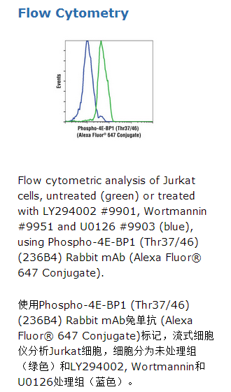 This Cell Signaling Technology (CST) antibody is conjugated to Alexa Fluor® 647 fluorescent dye and tested in-house for direct flow cytometric analysis of human cells. The unconjugated antibody, Phospho-4E-BP1 (Thr37/46) (236B4) Rabbit mAb #2855, reacts with Phospho-4E-BP1 (Thr37/46) from human, mouse, rat and monkey. CST expects that phospho-4E-BP1 (Thr37/46) (236B4) Rabbit mAb (Alexa Fluor® 647 Conjugate) will also recognize Phospho-4E-BP1 in these species.