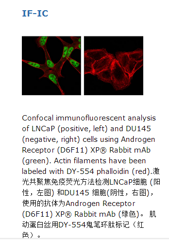 Androgen Receptor (D6F11) XP® Rabbit mAb能够检测内源性水平的总雄激素受体蛋白。该单克隆抗体是由对应人雄激素受体蛋白氨基末端区域的重组蛋白免疫动物而生产的。雄激素受体(AR)是锌指转录因子,属于核受体超家族,通过磷酸化和配体结合的二聚化被激活(1)。这促进了细胞核定位和雄激素靶基因中雄激素与应答元件的结合。 AR在男性发育和前列腺癌发展的几个阶段起着至关重要的作用(2,3)。