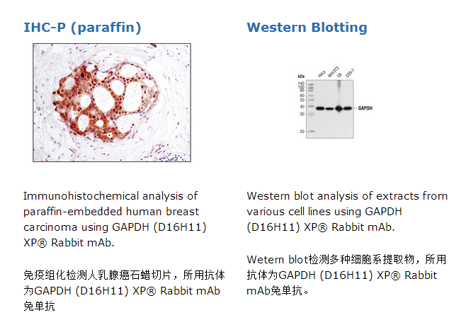 GAPDH (D16H11) XP® Rabbit mAb兔单抗用于检测内源性GAPDH总蛋白水平。该单抗是通过合成对应于人GAPDH蛋白羧基端序列的肽段免疫动物获得甘油醛-3-磷酸脱氢酶(GAPDH)在糖酵解过程中将3-磷酸甘油醛进一步磷酸化。虽然在不同组织中的表达水平有差异,但GAPDH普遍被认为是一个组成型表达的持家蛋白。正是由于这个原因,GAPDH的mRNA和蛋白通常在对其它有变化的靶蛋白测定实验时作为对照。最近的研究阐明了GAPDH在细胞凋亡(2),基因表达(3)和核转运(4)过程中的作用。GAPDH还可能对神经退行性疾病如亨廷顿和阿尔茨海默病的发生起着作用(4,5)。