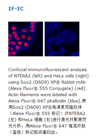 This Cell Signaling Technology antibody is conjugated to Alexa Fluor®555 fluorescent dye and tested in-house for immunofluorescent analysis in human cells. The antibody is expected to exhibit the same species cross-reactivity as the unconjugated Sox2 (D6D9) XP®Rabbit mAb #3579.