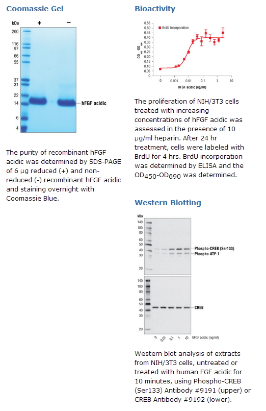 Cell Signaling Technology使用大肠杆菌表达人重组酸性FGF蛋白(hFGF acidic) Phe16-Asp155 (Accession #NP_000791)。重组的hFGF羧基端不含甲硫氨酸,分子量为12,835.DTT-还原和非还原状态下蛋白迁移速率与16 kDa的多肽相当。预测的重组hFGF氨基端序列通过氨基酸测序确认。6 μg还原和未还原的mEGF由SDS-PAGE测定纯度大于98%。所有批次的产品纯度均大于98%。重组hFGF的生物活性通过NIH/3T3细胞增殖实验而确认。每一批次的ED50均在7-20 pg/ml之间。1ug 酸性hFGF蛋白所含内毒素低于0.01ng。带载体:每1 μg 酸性hFGF溶于含有20 μgBSA、pH7.2的PBS溶液经0.22 μm滤器过滤后冻干。无载体:溶于pH7.2的PBS溶液经0.22 μm滤器过滤获得冻干物。酸性FGF是一种成纤维细胞和内皮细胞的潜在生长因子(1)。酸性FGF涉及损伤修复,血管生长和发育(1)。酸性FGF由细胞通过内质网/高尔基体的非依赖机制分泌产生(1,2)。酸性FGF与硫酸肝素的结合能力对于它与FGF受体结合并激活下游信号是必须的(1-4)。有4种不同的FGF受体,每一种都有多个剪切异构体(1,3)。酸性FGF与大部分但不是所有的FGFR有高亲和性(1)。酸性FGF结合FGFR激活的型号通路包括ras-raf-MAPK, PLCγ/PKC, 和PI3K/Akt信号通路(1)。