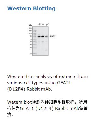 GFAT1 (D12F4) Rabbit mAb用于检测内源性GFAT1总蛋白水平。该单抗通过用对应于人源GFAT1蛋白Gly100位点周围残基序列的合成肽免疫动物制备而得。谷氨酰胺:6-磷酸果糖氨基转移酶1(GFAT1)是已糖胺合成过程中的限速酶(1)。该酶负责将6-磷酸和谷氨酰胺催化成6-磷酸葡萄糖胺和谷氨酸(2)。已糖胺的生物合成是蛋白质和脂质糖基化的基本途径(2)。除此之外,研究表明,该途径的激活是高糖诱导的胰岛素抵抗中的一个作用因素(1,2)。GFAT1在非胰岛素依赖型的糖尿病病人中活性升高(3)。在脂肪和骨骼肌组织中过表达该酶的转基因小鼠表现出胰岛素抵抗的表型(4,5)。GFAT2作为GFAT1的同工酶,随后被发现(6,7)。研究表明GFAT2的调控与GFAT1的不同,这预示着在同组织中的已糖胺的生物合成途径有着不同的调控方式(7)。