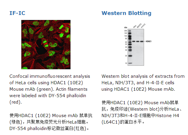HDAC1 (10E2) Mouse mAb鼠单抗能够检测内源性HDAC1总蛋白水平。该抗体不能源其它HDAC蛋白发生交叉反应。通过合成的与人源HDAC1蛋白羧基端相应的多肽片段去免疫动物从而制备出此单克隆抗体。组蛋白尾部的乙酰化可引起染色质成为松散的构象,这允许转录因子更易接近DNA。组蛋白去乙酰化转移酶(histone acetyltransferases,HATs)的鉴定和它们的多种蛋白复合物在它们怎样酶促调节转录中已经有了重要的见解(1,2)。HAT复合物可与特异性靶基因上序列特异的激活蛋白发生相互作用。除了组蛋白之外,HATs能够使非组蛋白乙酰化,这就认为这些酶的多种功能(3)。与此相反,组蛋白去乙酰化可促进一个致密的染色质构象,并且典型地导致基因活性的抑制(4)。哺乳动物组蛋白去乙酰化酶能按照它们的类似与多种酵母去乙酰化酶划分成三类(5)。Class I蛋白 (HDACs 1、2、3和8)是与酵母Hda1样蛋白相关,并且class III蛋白是与酵母Sir2相关。目前HDAC活性的抑制剂已经被认为潜在的治疗癌症的药物(6,7)。
