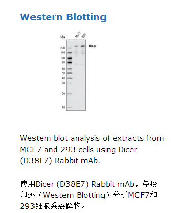 Dicer (D38E7) Rabbit mAb兔单抗检测内源性Dicer总蛋白水平。通过人工合成人源Dicer蛋白Ala1133位点周围序列相应多肽片段,使用该片段免疫动物从而制备单克隆抗体。Dicer是RNase III酶家族成员之一,它能特异性剪切双链RNAs从而产生microRNAs (miRNAs) (1)。在Drosha酶将长的初始转录本pri-miRNAs剪切成含有茎环pre-miRNAs之后(2),pre-miRNAs被转运到细胞质,随后进一步被Dicer酶剪切成含22个核苷酸的成熟miRNAs(3)。然后,成熟miRNAs成为RNA诱导的沉默复合物(RNA-Induced Silencing Complex,RISC)的一部分,从而能够结合目标mRNA的3'端非编码区(3)。