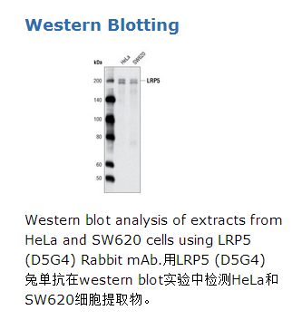 LRP5 (D5G4)Rabbit mAb 兔单抗识别内源性的总LRP5蛋白。此单克隆抗体由人源LRP5重组蛋白(胞外区域)免疫动物产生。LRP5和LRP6是单次跨膜蛋白,隶属于低密度脂蛋白受体(LDLR)相关蛋白家族。不同于其他LDLR家族成员,LRP5和LRP6胞外域有4个EGF和3个LDLR重复序列,胞浆域富含脯氨酸(1)。它们在经典Wnt/β-catenin信号通路中作为Wnt的共同受体(2,3)。LRP5和LRP6高度同源并且在发育过程中有多种作用(4,5)。LRP5和LRP6的活性在与Dickkopf (DKK) 家族某些蛋白结合后被抑制(6,7)。Wnt信号通路被激活后,LRP6可以被如GSK-3和CK1之类的激酶在多个位点被磷酸化,例如1479位苏氨酸,1490位丝氨酸和1493位苏氨酸(8-10)。磷酸化的LRP6招募axin蛋白到膜上以激活β-catenin信号通路(8-10)。LRP5蛋白参与骨稳态调节。LPR5的多态性和突变与骨骼疾病相关,如骨质疏松-假神经胶质瘤综合症以及高骨密度症[11-13]。此外,在甲亢功能亢进肿瘤和乳腺癌的病人中也发现了LPR5的突变(14,15).