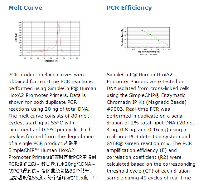 SimpleChIP® Human HoxA2 Promoter Primers contain a mix of forward and reverse PCR primers that are specific to a region of the human Homeobox A2 (HoxA2) promoter. These primers can be used to amplify DNA that has been isolated using chromatin immunoprecipitation (ChIP). Primers have been optimized for use in SYBR® Green quantitative real-time PCR and have been tested in conjunction with SimpleChIP® Enzymatic Chromatin IP Kits #9002 and #9003 and ChIP-validated antibodies from Cell Signaling Technology®. The homeobox gene clusters are silenced by members of the polycomb family.