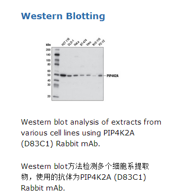 PIP4K2A (D83C1) Rabbit mAb兔单抗识别内源性水平的总磷脂酰肌醇 5-磷酸 4-激酶II 型alpha (PIP4K2A)蛋白。该抗体不与PIP4K2B或 PIP4K2C发生交叉反应,并且预计不与type I PIP5Ks或PIKfyve发生交叉反应。该单克隆抗体通过用合成肽免疫动物制备,该合成肽与人PIP4K2A蛋白靠近羧基末端的残基一样。磷脂酰肌醇 5-磷酸 4-激酶II 型alpha (PtdIns 4-Kinase type II alpha, PIP4K2A)是三个已知的II型磷脂酰肌醇激酶家族之一,包括PIP4K2A, PIP4K2B和PIP4K2C。每种激酶都可以催化5-单磷酸磷脂酰肌醇(PI5-P)磷酸化,形成4,5 - 二磷酸磷脂酰肌醇(PI4,5-P2)。PIP4K2A最初被认为是一个PI4-P5-激酶(1,2),之后,显示PIP4K2A 可以使PI5-P的4-位磷酸化,从而将其定义为一个新的脂质激酶家族(3)。在大脑中,PIP4K2A以最高水平广泛表达,已经在精神分裂症患者和其他神经元疾病患者中发现PIP4K2A突变(4-8)。PI 5-P的变化水平显著地响应于生理和病理性刺激(5-12),与核仁磷酸蛋白变性淋巴瘤酪氨酸激酶的细胞转化一样(13)。与此相反,低渗休克和组胺会降低PI5-P的细胞水平(14,15)。在响应DNA损伤和细胞应激中,PIP4K2A在抑制有丝分裂原依赖性的PI5-P增加过程中发挥重要作用(16-18)。PIP4K2A通过将PI 5-P转化为PI 4,5-P2来调节PI 5-P的水平,从而防止PI 5-P与ING2相互作用并调节ING2活性来激活p53和p53依赖的凋亡信号通路(19)。已经显示,PIP4K2A与PIP4K2B形成异二聚体,导致招募到细胞核。有趣的是,由此推论,PIP4K2A的活性是PIP4K2B的2000倍,表明这两个脂激酶串联起作用,PIP4K2B作为靶向亚基和PIP4K2A作为催化组分(18)。PIP4Ks同样可能在脂囊泡形成和/或高尔基体内稳态中起作用(20)。