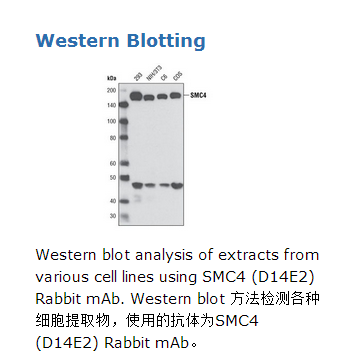 该抗体能够检测内源性SMC2总蛋白的水平。该抗体不与其它的SMC蛋白如SMC1,SMC3和SMC4交叉反应。该单克隆抗体是由合成的针对人SMC4蛋白的95位酪氨酸的肽段免疫动物生产的。染色体结构维持蛋白SMC2和SMC4是凝集蛋白复合体的亚基,该复合体有助于染色体聚集和维持分裂后期染色体向两极分化时的致密化(1-3)。除了调节染色体聚集外,凝集蛋白也是一个染色体结构调节子并且具有调节基因表达和DNA修复的功能。SMC蛋白含有一个隶属于ABC ATPase超家族的标志性二元ATPase结构域,由氨基末端Walker A模体核苷酸结合结构域和羧基末端的Walker B模体催化结构域组成,它们通过相互作用形成功能性的ATPase(1-3)。两个ATPase结构域通过两个卷曲螺旋结构域连接,一个核心的促使SMC蛋白相互作用的铰链区可以分离它们。在凝集蛋白复合体存在的情况下,SMC2和SMC4相互作用形成功能性的ATPase参与染色质聚集。然而,染色体结构调节的具体机制还在研究中。除了SMC蛋白以外,凝集蛋白还包含3个辅助亚基能够调节凝集蛋白的ATPase活性。高等真核细胞含有两个特异性的凝集蛋白复合体(凝集蛋白 I and II),都包含SMC2和SMC4(1-3)。凝集蛋白I也包含三个辅助亚基CAP-D2, CAP-G 和 CAP-H,而condensin II包含相关的辅助蛋白CAP-D3, CAP-G2 and CAP-H2。这两个复合体在细胞周期和染色体上呈现出不同的定位模式,且都为成功的有丝分裂所需,表明了其独特的功能(1-3)。