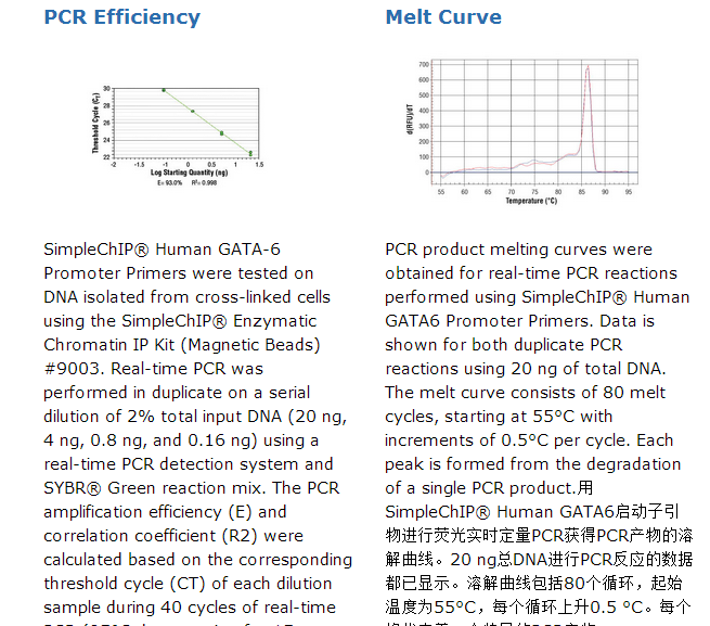 SimpleChIP® Human GATA6 Promoter Primers contain a mix of forward and reverse PCR primers that are specific to a region of the human GATA6 promoter. These primers can be used to amplify DNA that has been isolated using chromatin immunoprecipitation (ChIP). Primers have been optimized for use in SYBR® Green quantitative real-time PCR and have been tested in conjunction with SimpleChIP® Enzymatic Chromatin IP Kits #9002 and #9003 and ChIP-validated antibodies from Cell Signaling Technology. The GATA6 gene promoter is bivalent in stem cells, containing both histone H3 tri-methyl Lys4 and tri-methyl Lys27 epigenetic marks. When the GATA6 gene is activated during endoderm development, the promoter becomes monovalent, as the histone H3 tri-methyl Lys27 mark is removed and the tri-methyl Lys4 mark is retained.