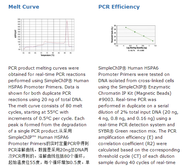 SimpleChIP® Human HSPA6 Promoter Primers contain a mix of forward and reverse PCR primers that are specific to a region of the human heat shock protein 6 promoter bound by HSF1. These primers can be used to amplify DNA that has been isolated using chromatin immunoprecipitation (ChIP). Primers have been optimized for use in SYBR® Green quantitative real-time PCR and have been tested in conjunction with SimpleChIP® Enzymatic Chromatin IP Kits #9002 and #9003 and ChIP-validated antibodies from Cell Signaling Technology®. The HSPA6 gene is rapidly induced by heat shock factors to help in refolding denatured proteins.