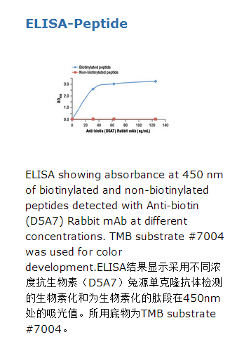 Anti-Biotin (D5A7) Rabbit mAb recognizes biotin attached to proteins, peptides, oligonucleotides, or solid matrices.