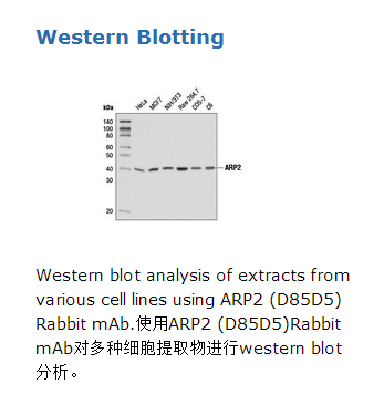 ARP2 (D85D5)Rabbit mAb可以识别内源性总的ARP2蛋白。单克隆抗体由合成肽段免疫动物产生,该肽段与人ARP2蛋白羧基末端附近氨基酸一致。Actin 成核作用——从已有的细丝形成新的肌动蛋白丝,会在细胞运动,分裂和细胞内示踪过程中影响肌动蛋白丝的结构。一个重要的actin成核作用蛋白复合物是高度保守的ARP2/3蛋白,由ARP2, ARP3,和 ARPC1-5组成。在激活了成核作用促进因子,类似WASP/WAVE 或 cortactin 后,ARP2/3复合物促进现有肌动蛋白丝形成分支以及姐妹肌动蛋白丝(1)。伪足的形成,降解胞外基质形成的小的细胞结构,能够被ARP2/3增强。ARP2/3与caldesmon竞争,caldesmon是一个肌动蛋白丝结合蛋白,负向的调控podosome形成(2)。与N-WASP一样,ARP2/3复合物能够调控核肌动蛋白丝的成核作用并控制肌动蛋白丝在转录期间的多聚化(3)。