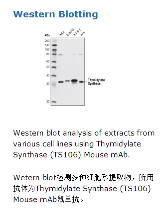 Thymidylate Synthase (TS106) Mouse mAb鼠单抗用于检测内源性&Thymidylate Synthase总蛋白水平。此单抗用全长的人重组胸苷酸合成酶免疫动物制备而得。在胸腺嘧啶核苷酸合成过程中,脱氧尿嘧啶的甲基化,生成脱氧胸腺嘧啶核苷酸是一个关键步骤(1,2,reviewed in 3)。此过程由胸苷酸合成酶(TS或者TYMS)催化,它是由两个30 kDa的亚基组成的同源二聚体。TS是一个胞内酶,负责催化胸苷酸的从头合成反应,因此是DNA合成过程中的必需酶,在增殖细胞中的活性最高(1)。作为脱氧胸腺嘧啶核苷酸的唯一来源,TS是抗瘤药物如5-FU的一个重要靶点(1-5)。5-FU作为TS的抑制剂,在对抗实体瘤,如结肠,乳腺,头,颈肿瘤时作用显著。研究表明,有癌转移的病人,TS的表达水平较低,对5-FU处理比较敏感,而TS表达水平较高的病人对药物不太敏感(5)。TS的表达可能有助于预测病人的总体生存情况,但TS表达对于不同类型的癌症预后的预测价值还正在研究当中(6-10)。