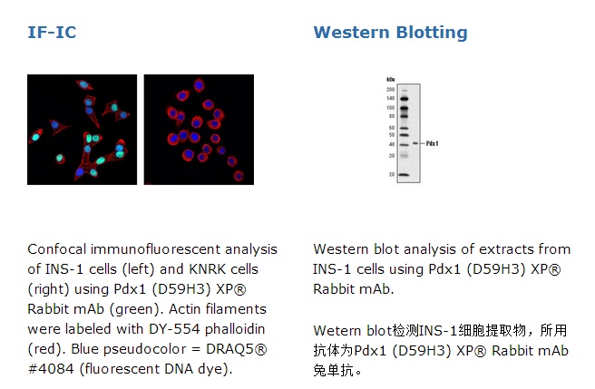 Pdx1 (D59H3) XP® Rabbit mAb兔单抗用于检测内源性Pdx1总蛋白水平。胰腺十二指肠同源框基因1(Pdx1)是胰腺发育,β细胞分化和成熟β细胞功能的一个转录因子(1,2)。它在内胚层向胰腺以及随后的β细胞发育过程中起着关键的作用(2,3)。在成熟的胰腺组织中,Pdx1的表达仅局限于胰岛β细胞中(3),它可以促进β细胞多种功能基因的表达,如胰岛素,萄糖激酶和Glut2(4-6)。Pdx1基因的突变跟糖尿病和胰岛功能缺失相关(7)。